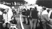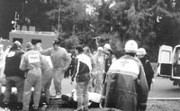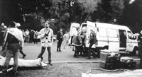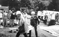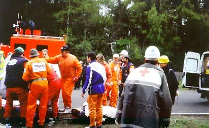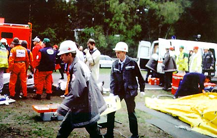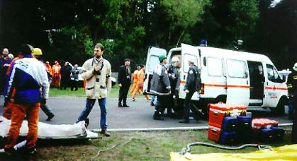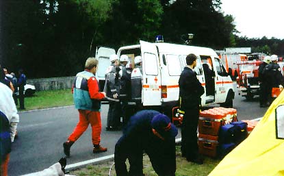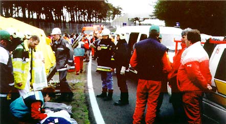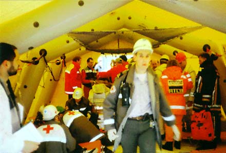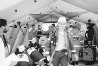 van het materiaal bij aankomst op het ramp- terrain. Foto 5: In afwachting van de opening van de hospitaal- tent wordt reeds met de hulpverlening op het terrein gestart. Foto 6: Uitladen materiaal. Foto 7: Wegens gebrek aan een VMP worden de slachtoffers ter plaatse gestabiliseerd, met de nodige chaos tot gevolg. |